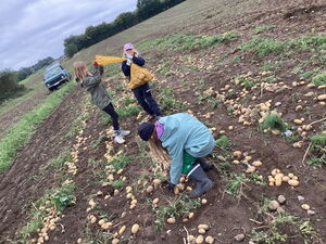 Am vergangenen Freitag ging es für die Klassen 3a und 3b auf den Acker zu Bauer Uwe Wagner. Dort fand im Rahmen der Draußenschule für die beiden Klassen die Kartoffelernte statt. Nachdem im Sitzkreis ein wenig theoretisches Wissen rund um die Kartoffel besprochen wurde, ging es danach aufs Feld. Mit vollem Einsatz ernteten die Kinder über 20 Säcke Kartoffeln. Als nichts mehr zu finden war, wurde sogar noch selbstständig gerodet. Auch Schulhund Bootsmann, der die Klassen begleitete. Konnte sich auf dem Acker ordentlich austoben. So kehrten nach der dritten Stunde alle glücklich, erschöpft und teilweise ganz schön schmutzig in die Schule zurück.